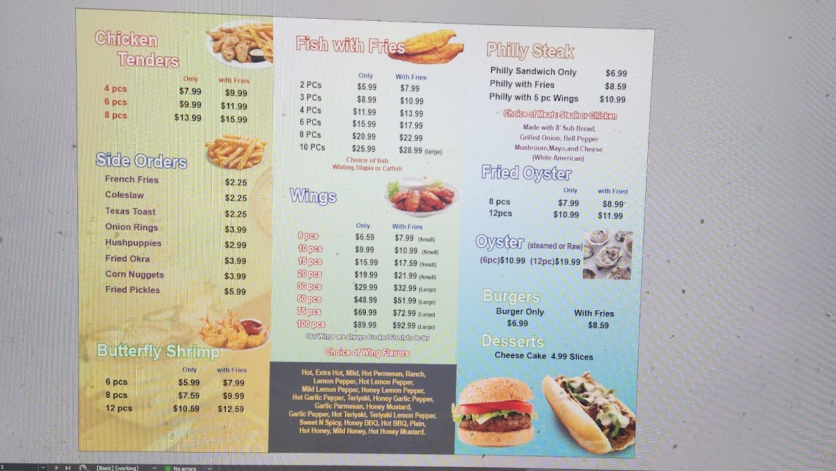 The menu features a variety of delicious combos that cater to all cravings. Treat yourself to the 10 Piece Wings combo with fries and a drink for just $16.99, or savor the 6 Piece Wings & 5 Pieces Shrimp for $19.49, perfectly fried and bursting with flavor. Seafood lovers will appreciate options like the Fish & Shrimp duo, while those craving comfort food can indulge in tasty Cheeseburgers and Fried Rice dishes.